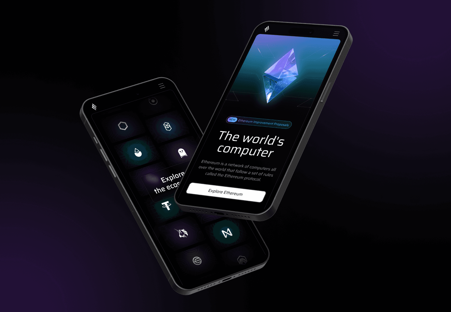 Desktop & Mobile Interfaces: Responsive UI layouts using bento grid structures, fluid navigation, and generative motion principles. Designed for Ethereum.org and community tools.