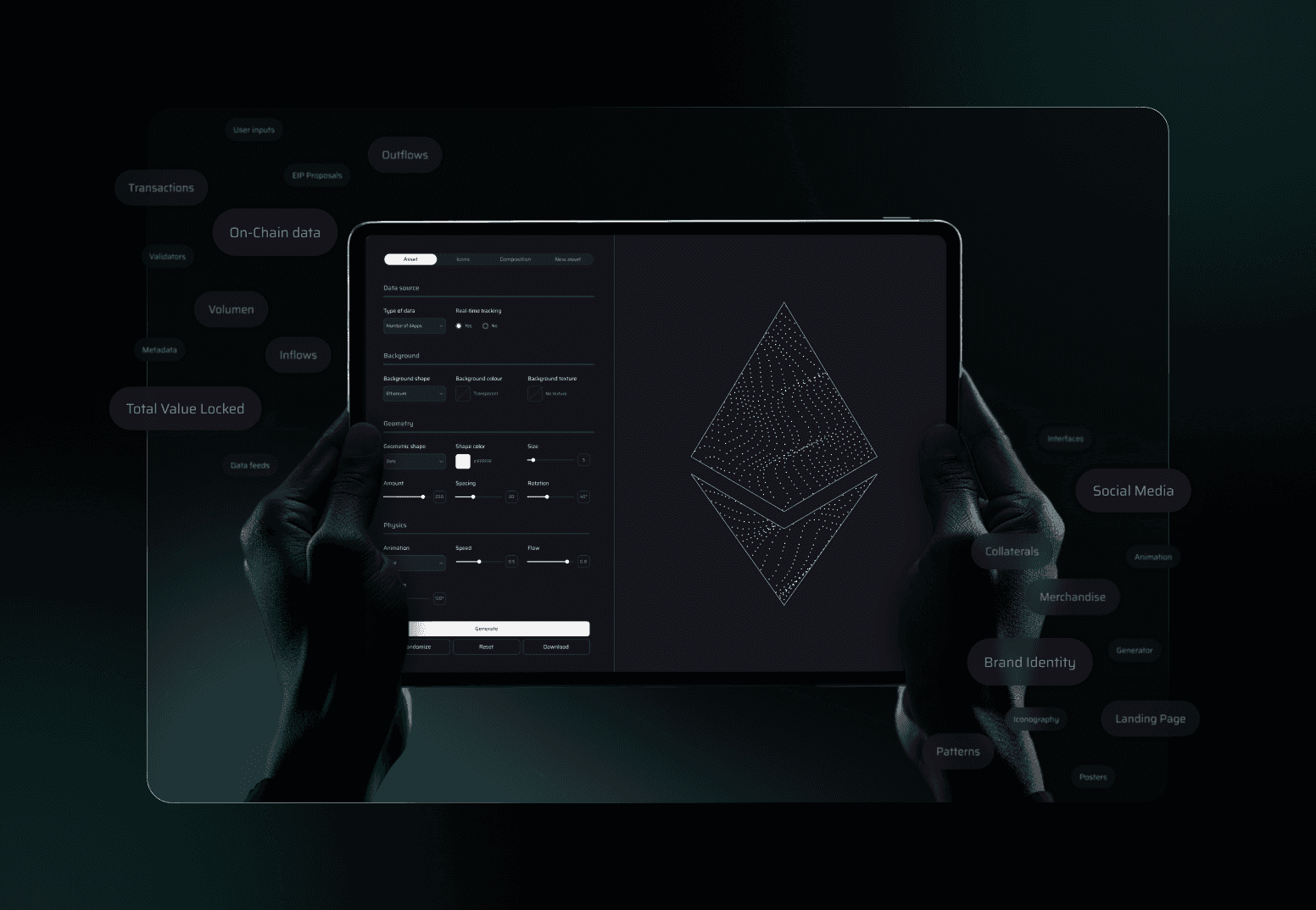 Generative Toolkit - The generator is the beating heart of the system. Driven by real-time blockchain data, it creates infinitely variable assets that remain consistently on-brand. This not only improves efficiency and customization but also brings Ethereum’s dynamic nature to life.